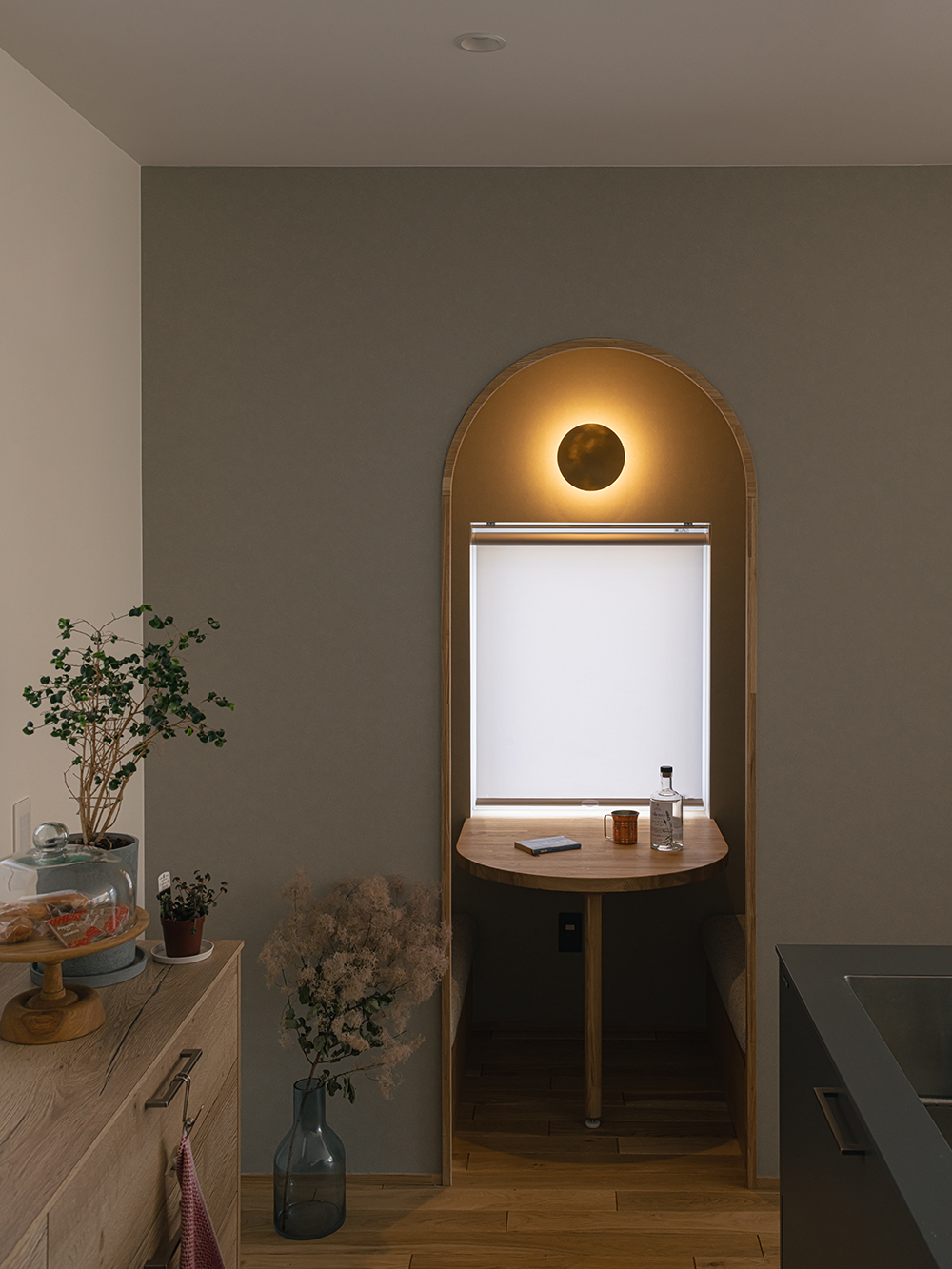 窓の上には、ご夫婦の世界観に合わせて設計スタッフがご提案した円盤状のライト。この照明は「満月みたいでかわいい」と奥さんのお気に入りに。