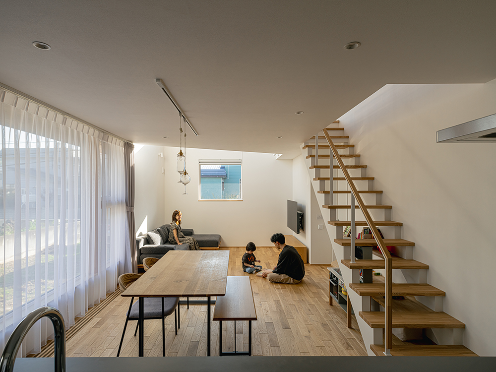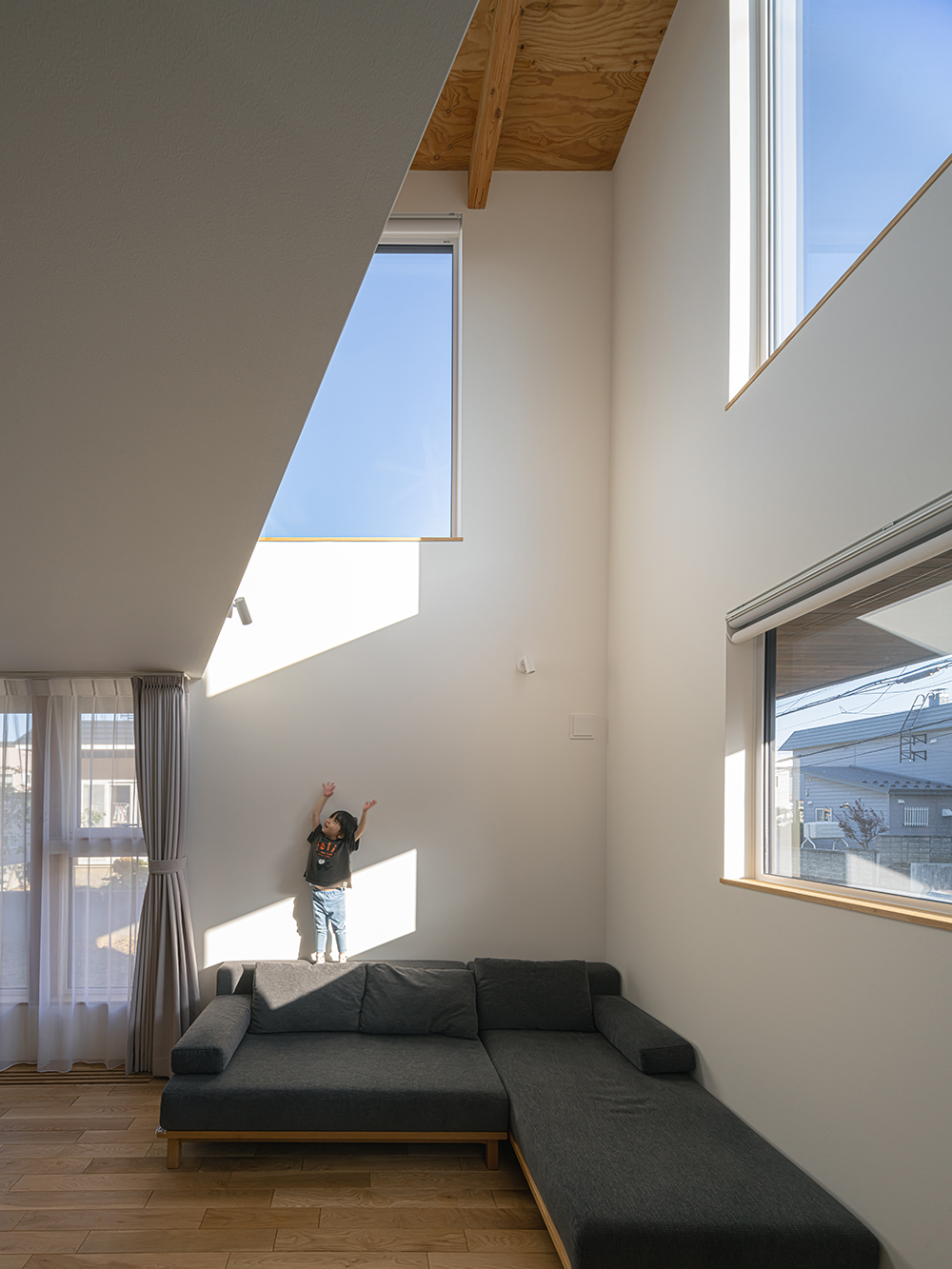 このスペースはリビングへの採光を考えての設計で、住宅街の周囲からの目線に考慮して1階リビングには大きな窓をつけず、その代わり上階のフリースペースに大きな窓を確保。