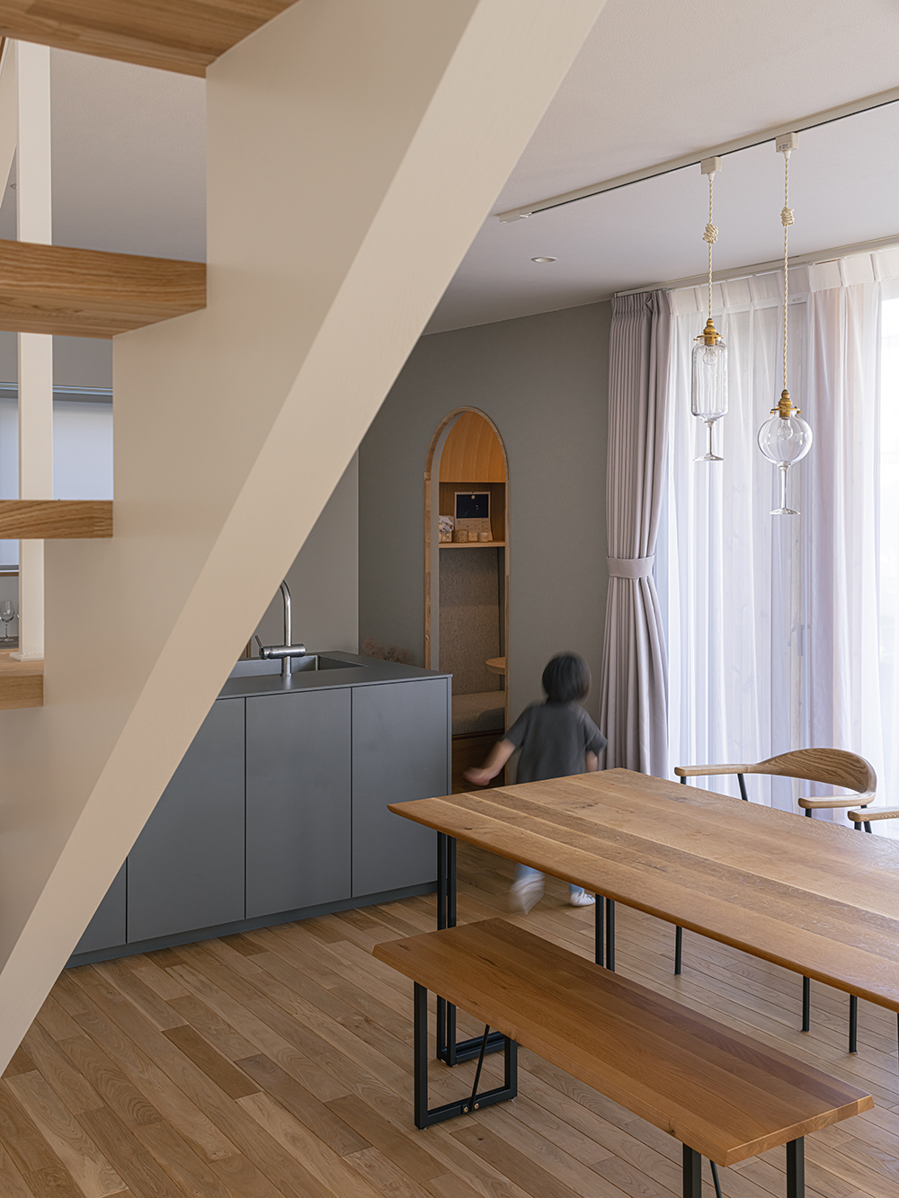 設計スタッフはこのご希望を受けてプライベート空間でありながら、ご家族の気配を感じるようヌックをリビング奥に配置。