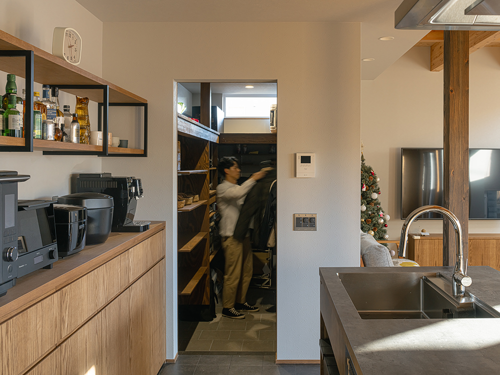 アウトドア好きのご夫婦がキャンプ道具などを置きたいと希望していた土間収納をさらに有効活用できるよう、設計スタッフは玄関とキッチンをつなぐように配置しました。
