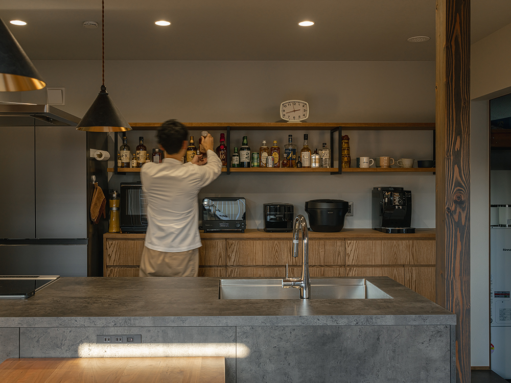 カップボードの上の棚は扉なしのシンプルな形に。ここには「眺めるのが趣味」という旦那さんのウィスキーボトルが並べられ、見せる収納として活用されています。