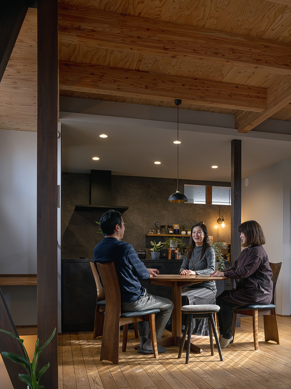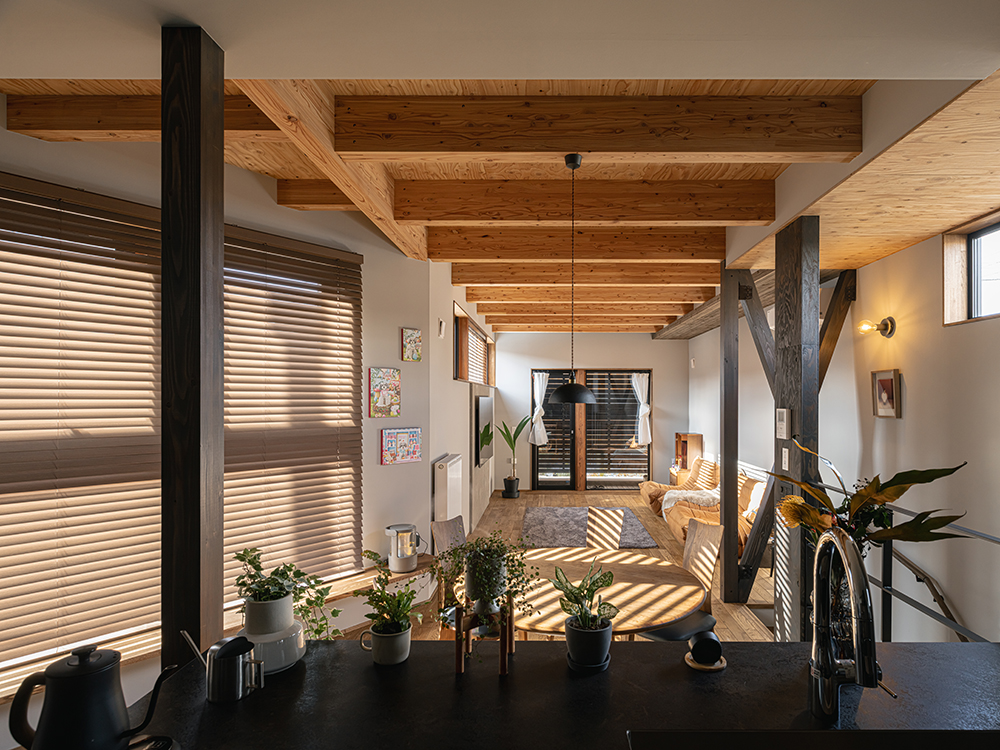 塗装をした筋交やグレーを基調にしたキッチンが調和する、木の質感を大切にした落ち着きのある空間。
