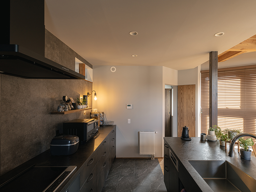 グラフテクトのキッチンに合わせ、背面の壁もグレートーンで統一。