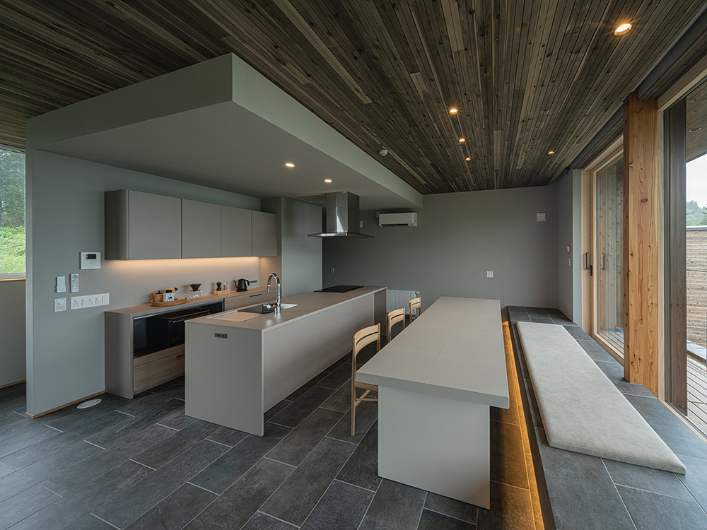 一面の窓に沿ってベンチを設け、どこからでも海を眺められる設計で、