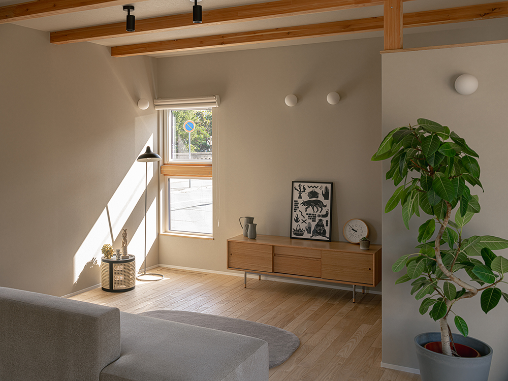 企画住宅でありながら、注文住宅と同等の性能とデザイン性を備え、 床・柱・天井・梁には道産木材を用い、長年磨き上げてきた高気密・高断熱の性能もそのままに。