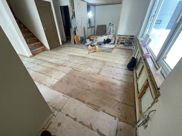 ↓写真奥の部屋はもともと和室でしたが洋室に変更するため、畳を剥がし、リビングと床の高さを揃えました。