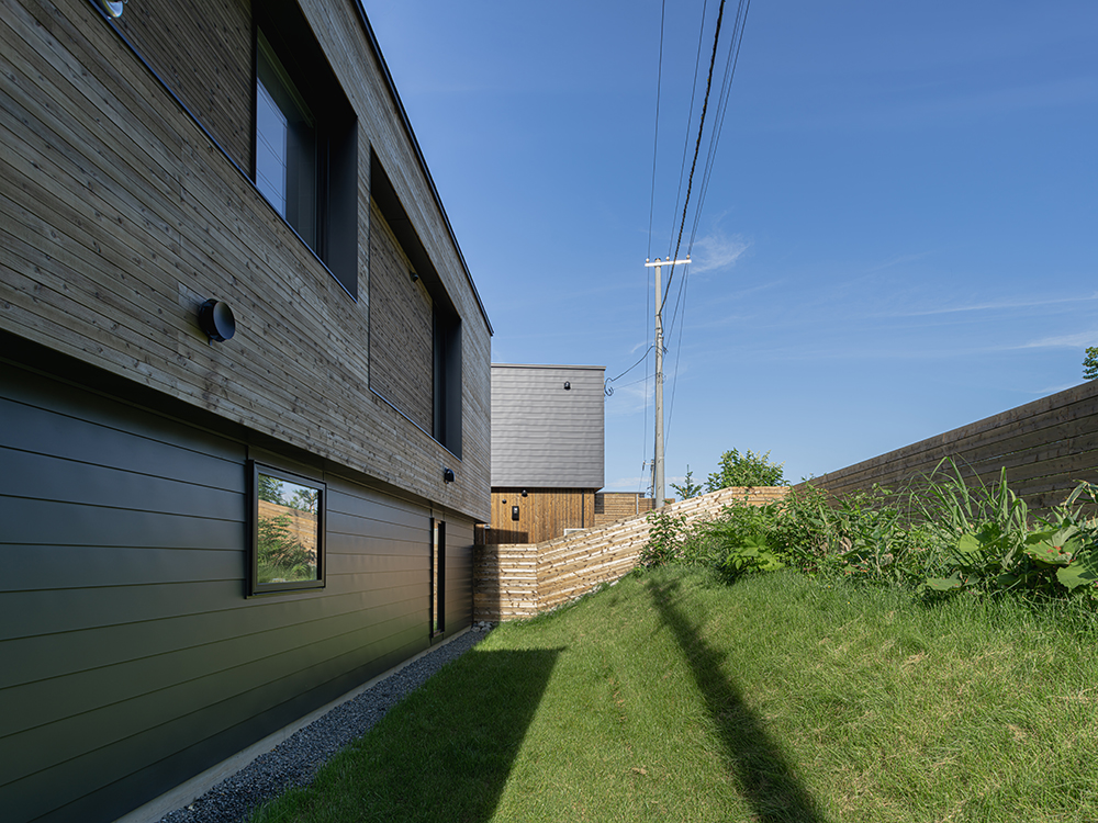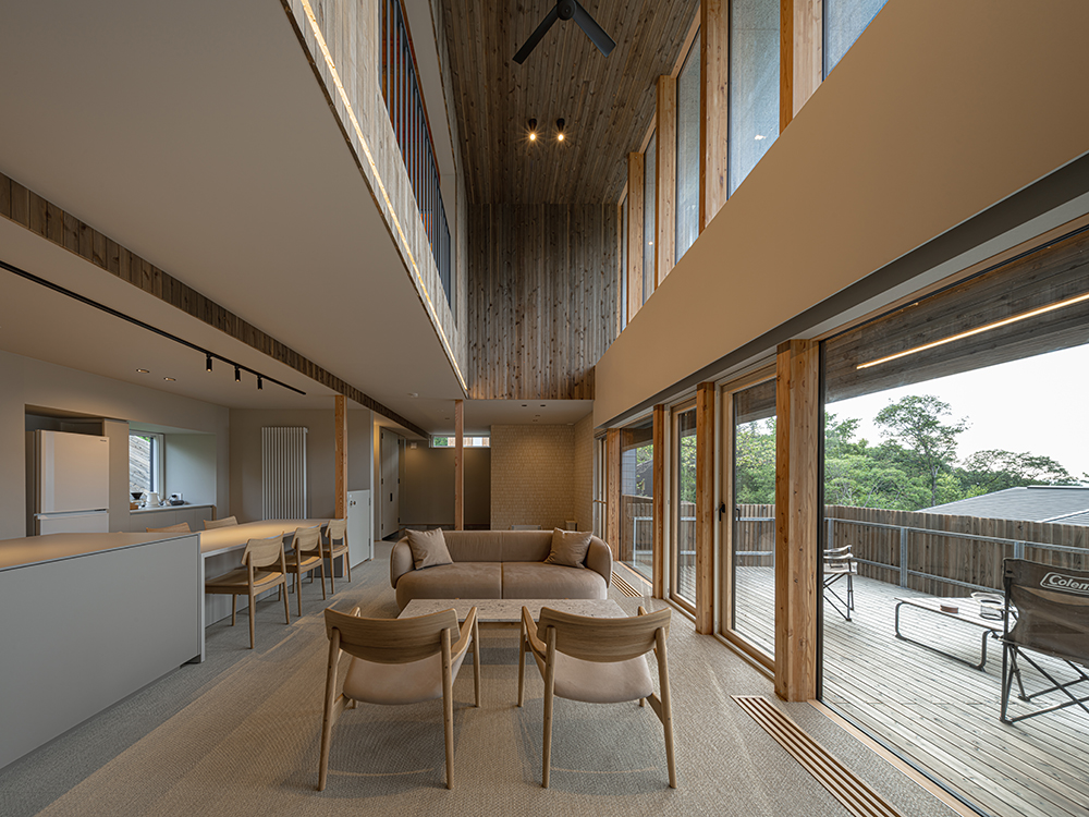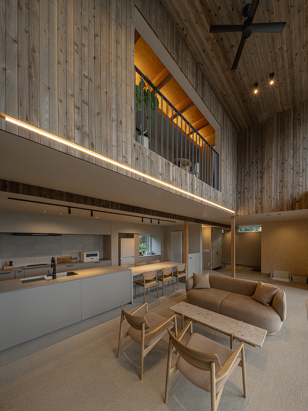 建物全体はワントーンの色味で統一し、吹抜け部分には道南杉の羽目板を贅沢に用いることで、