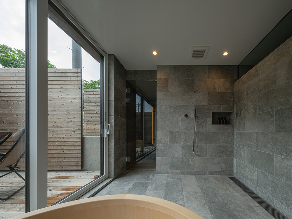 1階の浴室は、円形の檜風呂との調和を考え、タイルと塗り壁を組み合わせた和モダンな空間に。