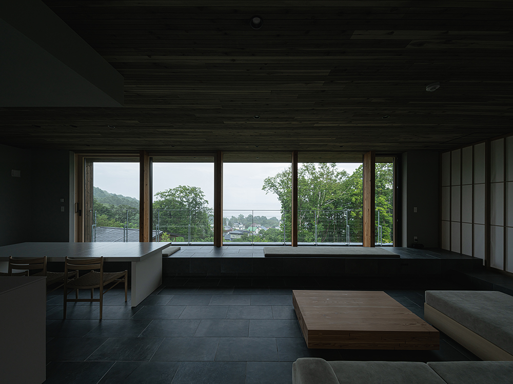 階段を上がると、正面には海を望む大開口の窓が広がり、訪れる人に印象的なギャップを与えます。