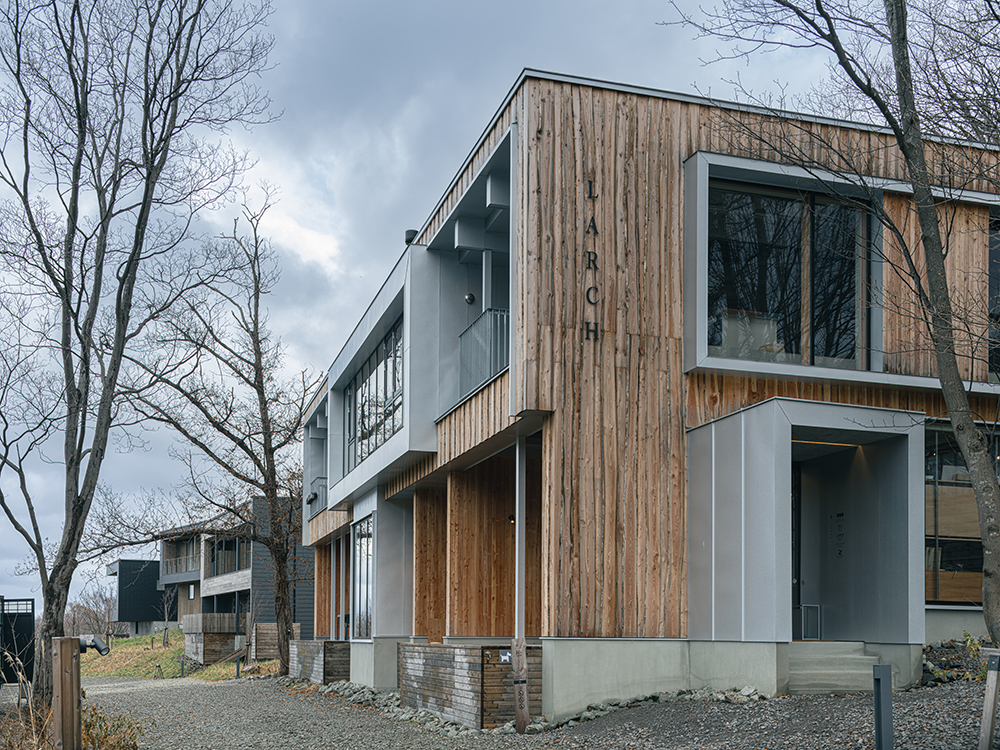 外壁には、木こりが伐採した道産カラマツの耳付き板材を採用。