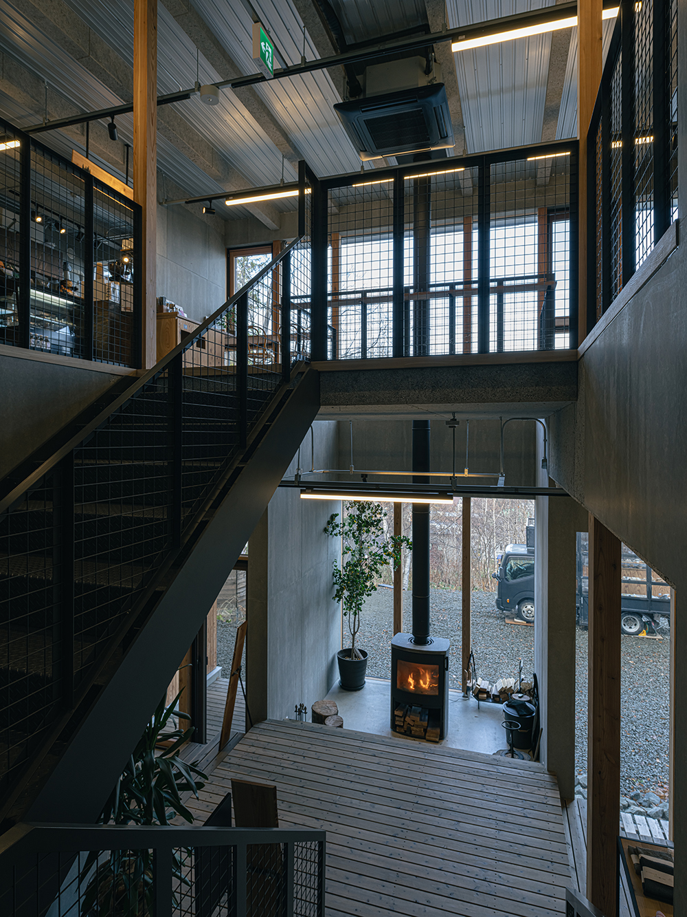 テナント同士の関係性に配慮しながら階段を中央に配置し、1階には薪ストーブを設置。
