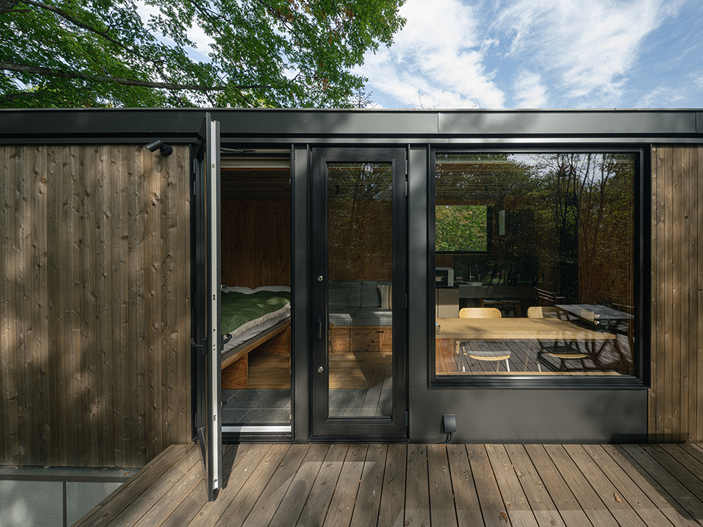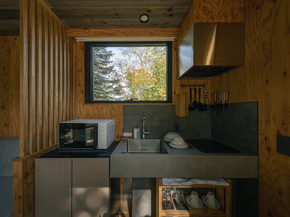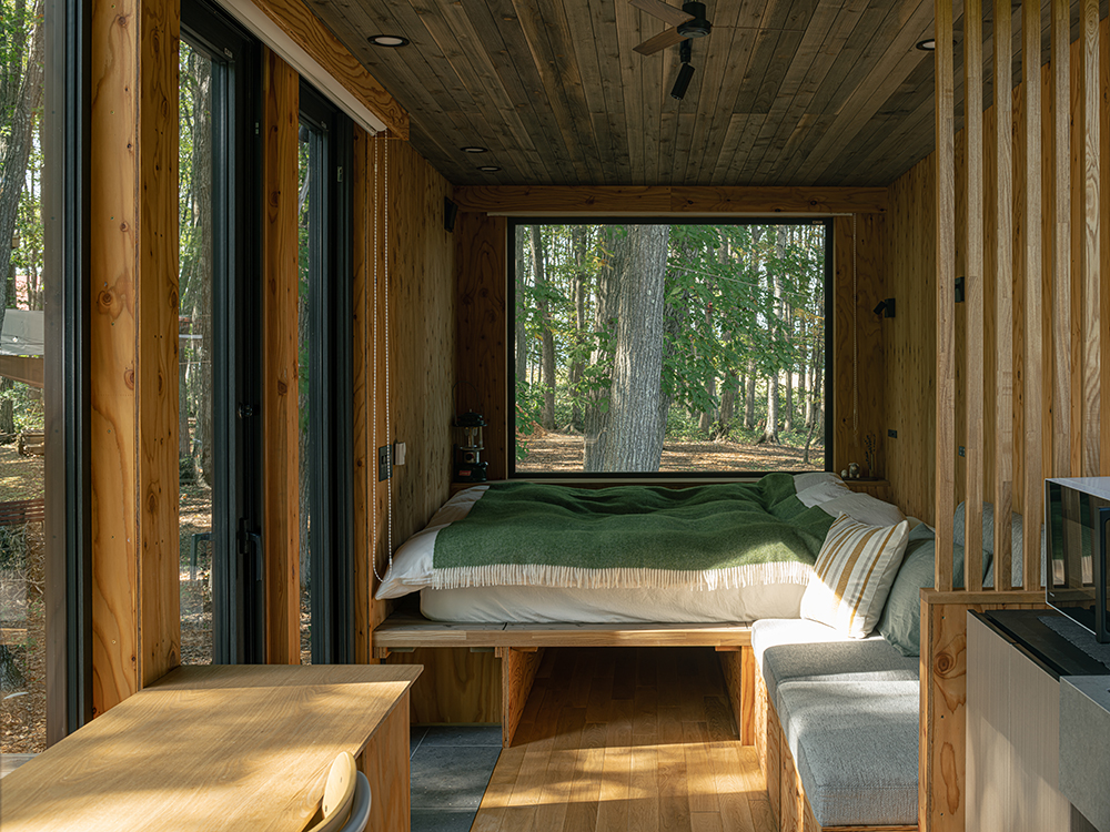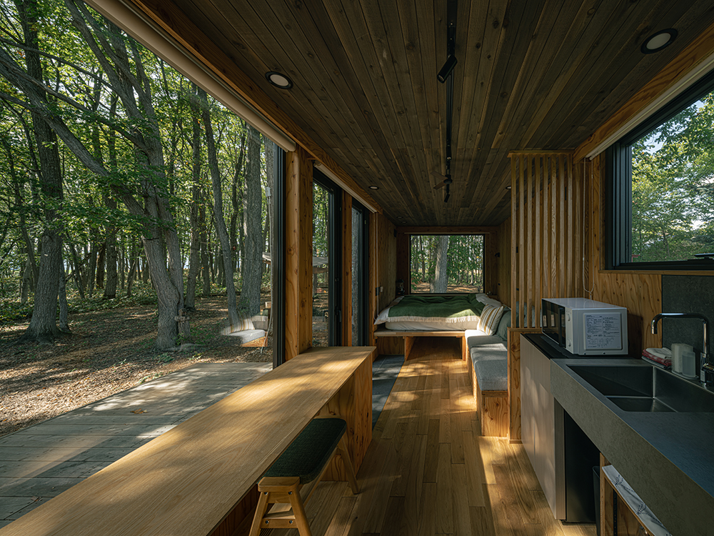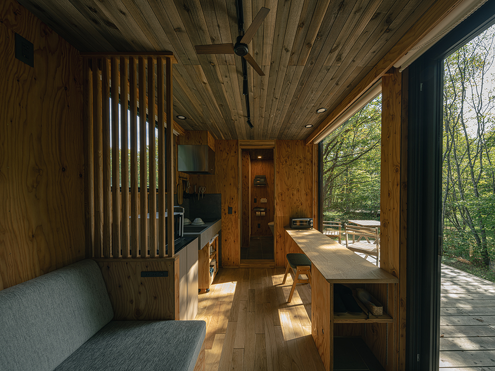 移動を前提としたコンテナという特性にも着目し、建物全体は木板仕上げで設計。