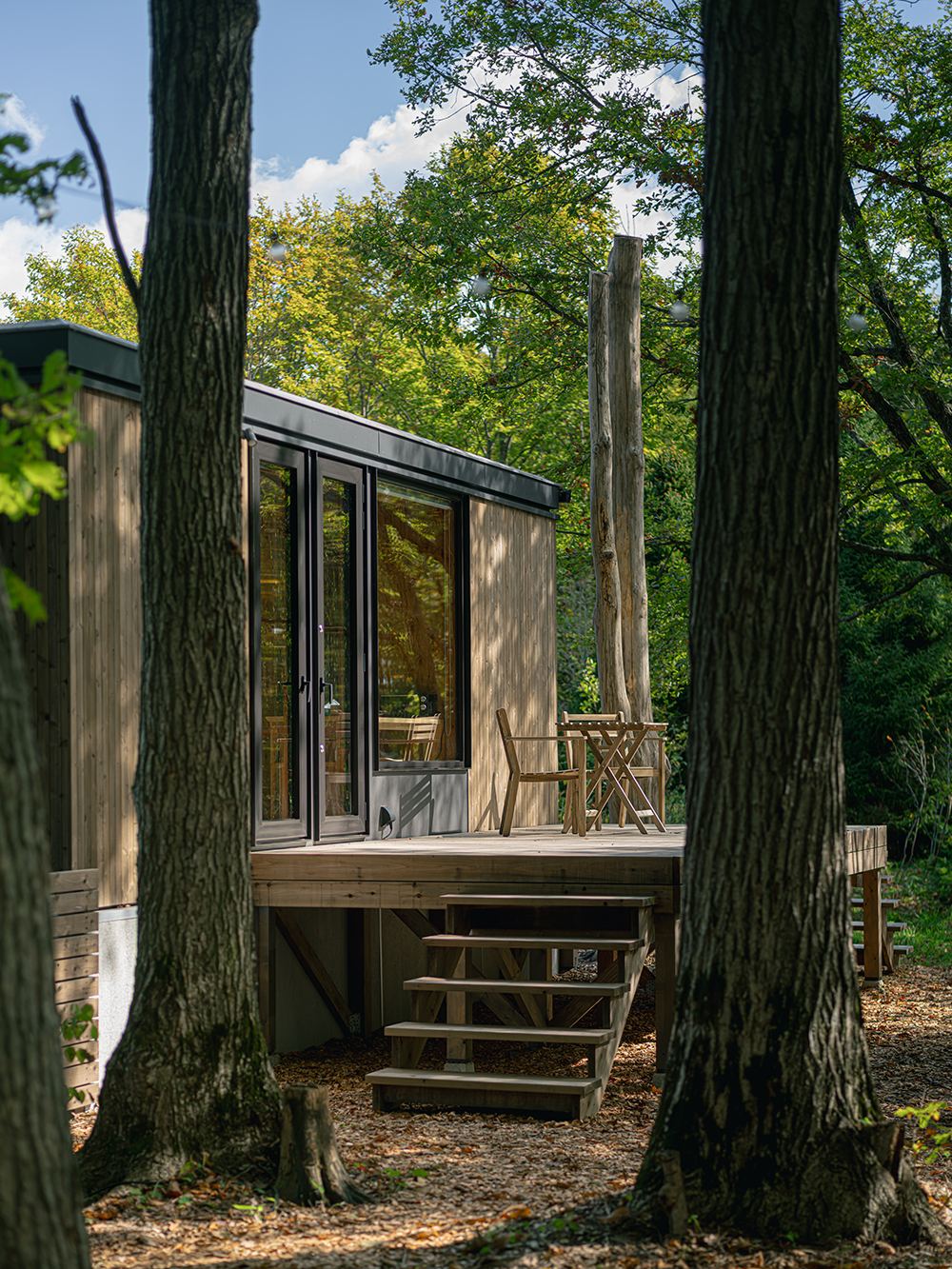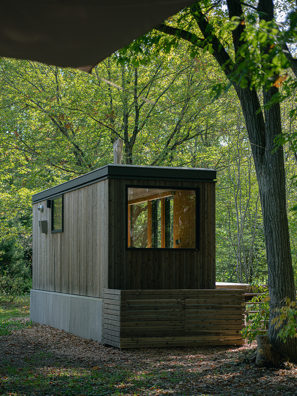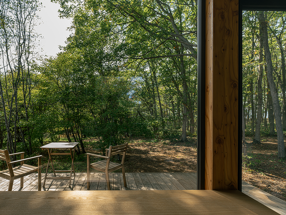 移動を前提としたコンテナという特性にも着目し、建物全体は木板仕上げで設計。