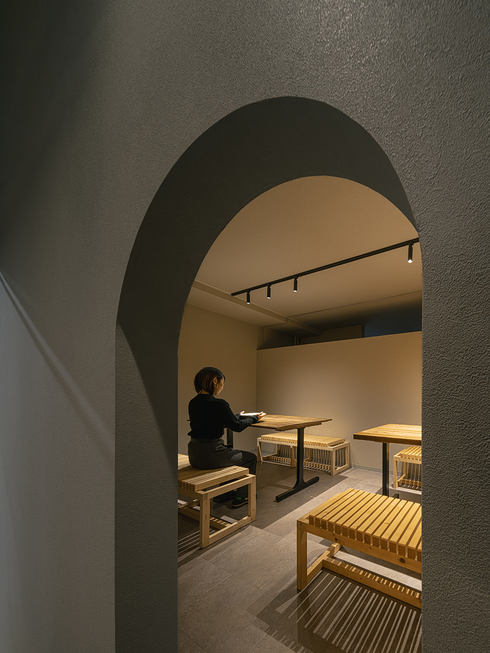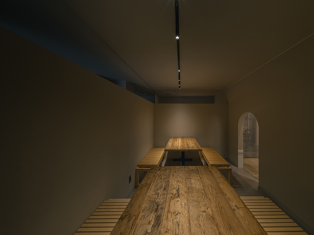 テーブル席のスペースは、少し低めのアーチ状入口によって特別感を演出。