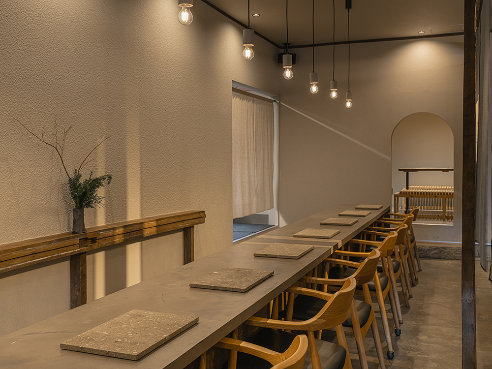 座って正面に見える壁面には、塗り壁のようなざらりとした質感が特徴のアクリルスキンを使用し、カウンター席全体で素材の表情を感じられる空間としています。