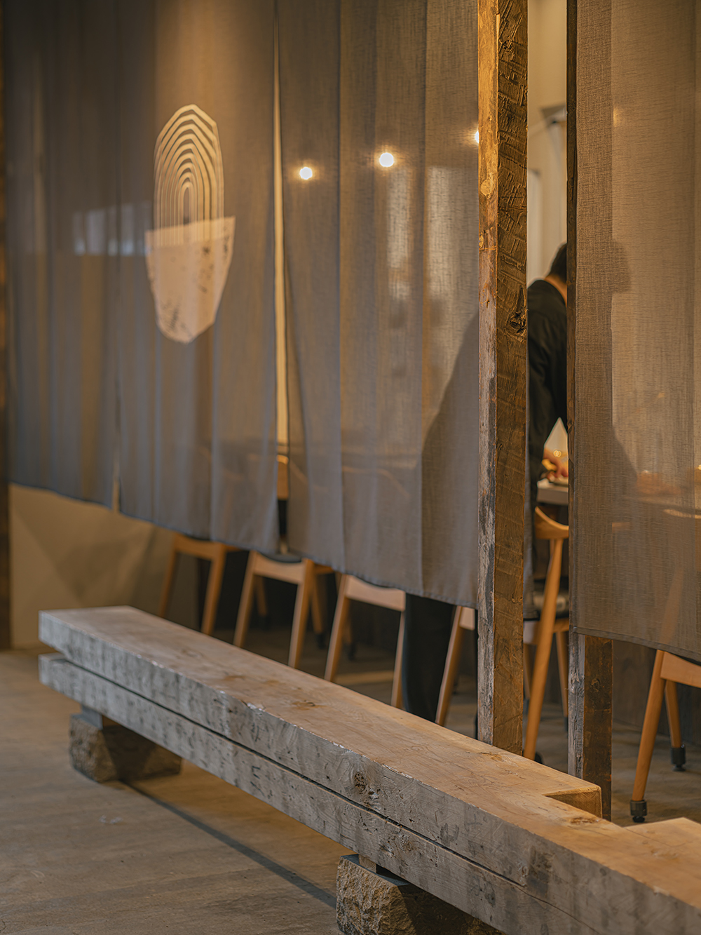 あえて加工を施さず継手や墨を残したまま暖簾まわりの梁や柱、待合ベンチに使用、その他さまざまな場所に古材を取り入れることで、空間全体に味わいのあるアクセントを与えています。