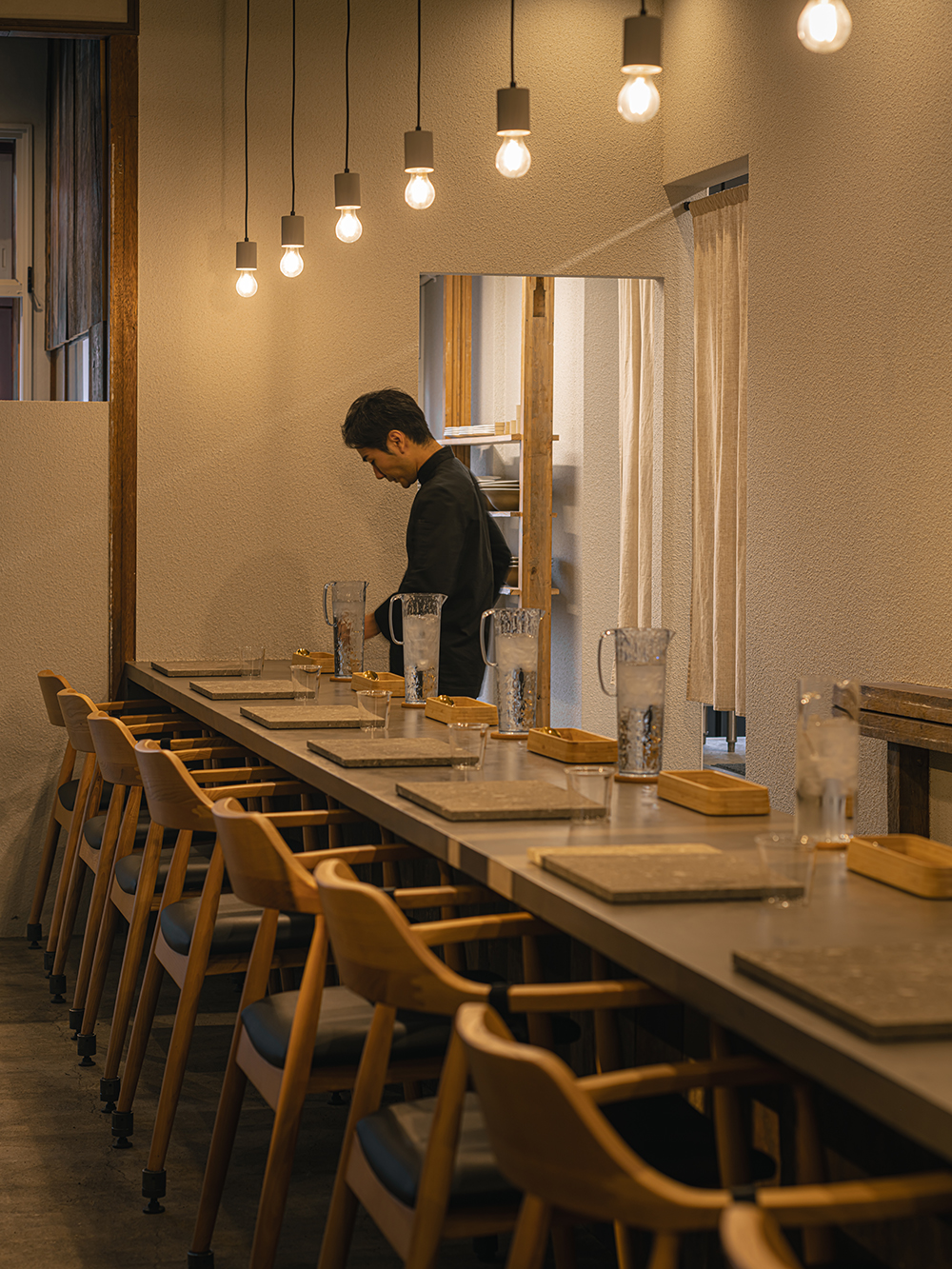 メインカウンターと透け感のある暖簾が印象的な構成としながらも、既存建物の仕上げや構造との調和を大切にし、蘭越町の工場から仕入れた古材を採用。